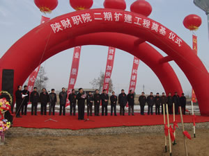 上午11时,省财厅厅长刘维隆、咸阳市委书记张立勇、副市长李永民等领导来到学院建设工地,出席工程奠基仪式。他们拿起铁锹,抛起学院扩建工程的第一铲奠基土。省厅、市委市政府领导一直关心着职教事业和学院的扩建。领导们在交谈中认为,搞好陕财职院建设,扩大规模,增强实力,这对职业教育事业和城市建设、发展地方经济都是相得益彰的喜事好事,直接为咸阳北大门增加了一道亮丽的风景、为创建园林式城市增光添彩。