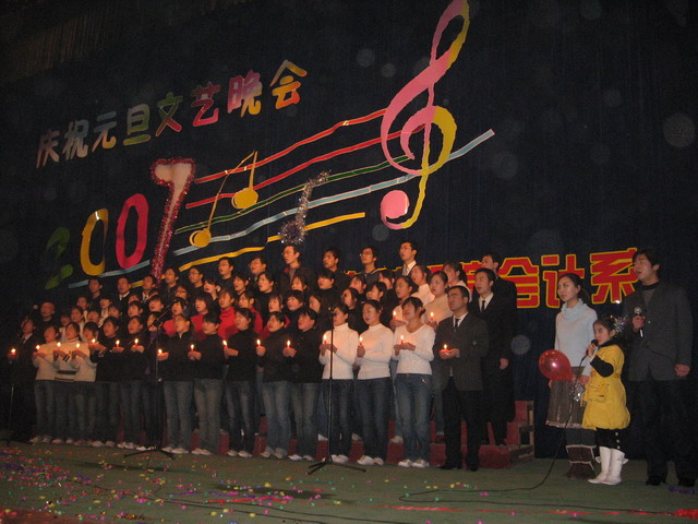 光阴荏苒,时光飞逝,转眼又迎来了新的一年。我们欢聚一堂,回首以往令人难忘的时光,同时也展望2007年的新气象。2007年陕财职院会计系庆祝元旦晚会,在全系师生的共同努力之下,经过细心的准备,精心的筹划,于12月20日晚7:30在学院大礼堂隆重举行。晚会受到了学院领导的重视,各职能部门的大力支持,院党委书记文锋、副院长刘晓玉、党委书记刘文雅、各系部处室负责人及教师、学生共计1500余人观看了元旦晚会演出。院长舒煜在百忙之中也发来了贺电,祝愿各位老师阖家欢乐,各位同学身体健康、学习进步。