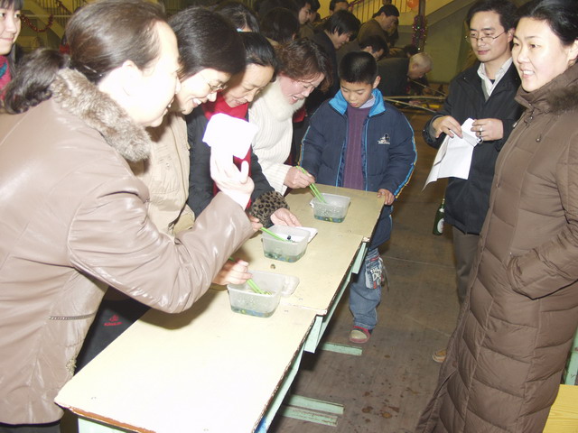 最热闹的可能要算“我来比画,你来猜”的活动现场了。也许是受央视“幸运52”的影响,组成对的教职工纷纷上场,一个比画,一个猜,一些奇怪的比画和怪异的回答,惹得观众蹊啼笑皆非,如马冀老师在给搭档比画“斑马”时,急中生智说:“我是身上有许多斑斑点点的动物”,搭档应声说“斑马”,周围刹那发出哄堂大笑。其次要数“枪凳子”现场了,这是一个锻炼反映、考验耐力和心智的活动。10人一组,在锣声中围着9把凳子转圈,锣声一落,开始枪坐凳子,没有抢到的就淘汰出局,依次递减凳子,重新开始,直到抢到最后一把凳子者胜出。一个回合下来,很多人已经大汗淋漓,既愉悦了心情又锻炼了身体。不少退休的职工也乘兴参加了活动,在“夜寻宝岛”现场,他们被蒙上眼睛,用磁铁块去粘贴数米外的地图上的台湾岛,有的粘贴得惊人准确,有的则相差甚远,甚至粘贴到了境外,逗得旁人大笑不已,整个现场充满了祥和喜庆的气氛。不少职工说,好久没有这样热闹和开心地迎新年了。