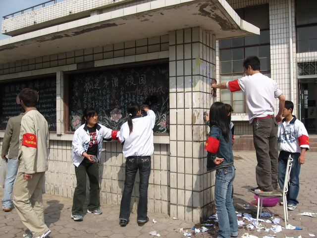 当日上午拉开了活动的序幕。团委组织40余名学生会干部,花费3个多小时时间,对校园中那些有损文明、影响校容校貌的乱涂乱画现象进行了整顿,集中清理黑板报、公告栏之外的通知、海报、宣传画和围墙、电干、廊柱和树木上的野广告。又在公共场所合理设置了信息发布栏并对其外观进行了规范;发布了《信息发布文明公约》;在醒目位置张贴了禁止乱贴的《特别提示》。