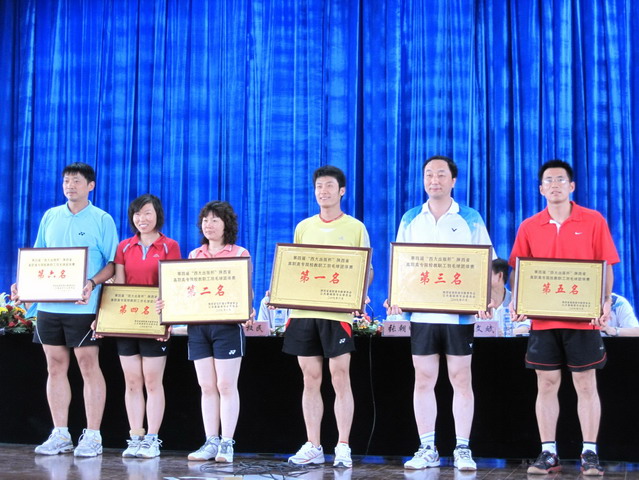 6月13日至14日,第四届陕西省高职高专院校教职工、校领导、体育部长羽毛球比赛暨校领导乒乓球象棋友谊赛在陕西国防工业职业技术学院举行。来自全省十几所高职高专院校的上百名教职工队员和校领导参加了比赛。我院组织了以副院长刘晓玉为领队、院领导阎平、刘建彪、王文汉、范忠,工会主席杨新彪及12名教职工为队员的代表队参加了这次比赛。