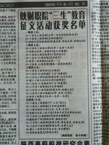 为了保证征文大赛的公平、公正,财税系专门聘请了咸阳师范学院4名语文老师对稿件一一进行审评,通过两天时间的认真评比,有28篇优秀稿件脱颖而出。为了公平起见,对这些获奖作品的作者和文章,评审小组还一一进行了是否为原创作品的询问和核实。可喜的是,这些高质量的作品全部为学生原创作品,有些就是自己的亲身感受,它们反应出当代大学生对生命的思考、对生命的珍惜。为了扩大“三生”征文教育成果,我们将向《陕西财经教育报》推荐优秀作品,以便促使更多学生受到启发和思考,进而珍爱生命、学会生存、健康生活。