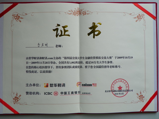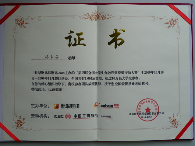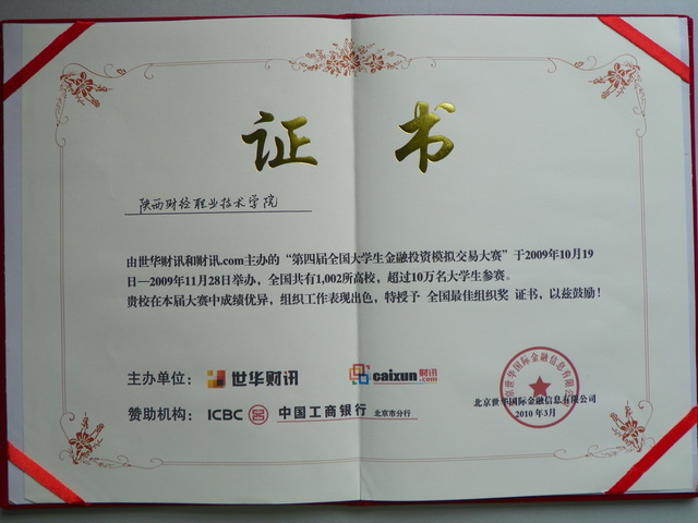 由世华财讯和财讯.COM主办的“第四届全国大学生金融投资模拟交易大赛”,于2009年10月1日—2009年11月8日在全国范围举行,本次竞赛分股票组、外汇组、期货组、股指期货组四个组比赛。陕财职院财政税务系组织全院近20个班,346人次学生参加了本次竞赛。
