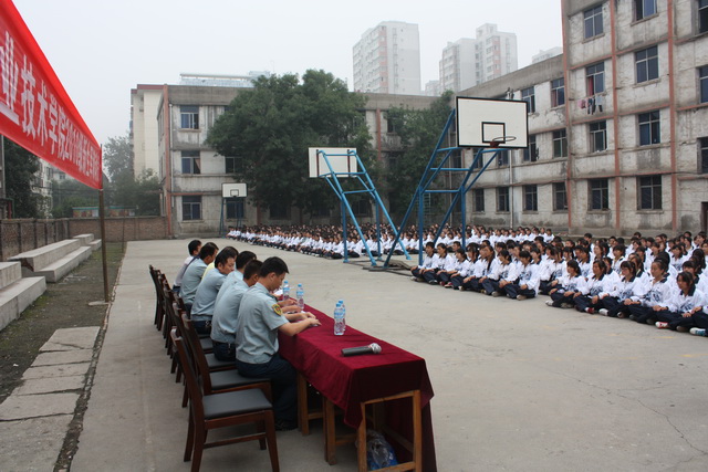 军训团团长杨庚辰,副团长张有斌,参谋长杜飞,副参谋长卢允松,副政委王铁练、雷旭,主任甘少华,副主任张朴在主席台就座,南校区全体辅导员坐于军训队伍后面,出席并参加了此次军训动员大会。大会由副政委雷旭主持。
