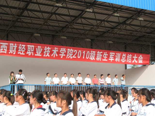 2010年9月2日至9月17日,陕西财经职业技术学院对2010级1600多名新生进行了军训。历时15天的军、政、管正规化军营生活,于9月17日落下了帷幕。17日上午,在塑胶操场隆重举行了陕西财经职业技术学院2010级新生军训总结大会,出席会议的领导有:院长阎平同志、副院长范忠同志、刘晓玉同志、刘建彪同志,王文汉同志、副书记刘文雅同志、军训团团长杨庚辰同志、军训团副团长张有斌同志以及学生工作处副处长和团委书记等同志,刘晓玉同志主持了会议。
