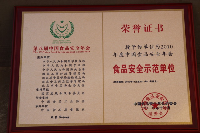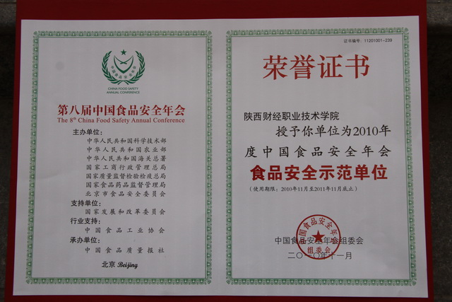 2010年11月20日至21日,全国第八届中国食品安全年会在北京人民大会堂召开,此次年会由中华人民共和国科学技术部、农业部、海关总署、国家工商行政管理局、国家质量监督检验检疫总局、国家食品药品监督管理局、北京食品安全委员会主办。参加年会的代表来自全国31个省、市、自治区的食品企业、大专院校饮食服务工作者共计800多名。全国人大常委会副委员长周铁农宣布大会开幕,关工委主任、十届全国人大常委会副委员长、中国食品安全年会名誉会长顾秀莲致开幕词,全国政协副主席白立忱作了重要指示。国务院食安委办公室张勇主任、全国人大财经委石秀诗主任、科技部王伟中副部长、农业部陈晓华副部长、国家工商总局王东峰副局长、国家质检总局蒲长城副局长、国家食品药品监督管理局边振甲副局长、北京市食品安全委员会王建华副主任分别作了重要讲话。会议还聘请了中国工程院陈君石院士、台南科技大学生物科技系教授张春生及有关部委专家共计10人分别就食品安全工作做了专题报告和讲座,随后会议还进行了经验交流,大会宣读了《2010食品安全(北京)宣言》。会议最后给评选出的食品安全示范单位授予2010年度《食品安全示范单位》荣誉称号,颁发了奖牌和荣誉证书。我院在此次会议喜获“2010年度中国食品安全年会“食品安全示范单位”荣誉称号。学院副院长王文汉、膳食科长史谦参加了本次大会。