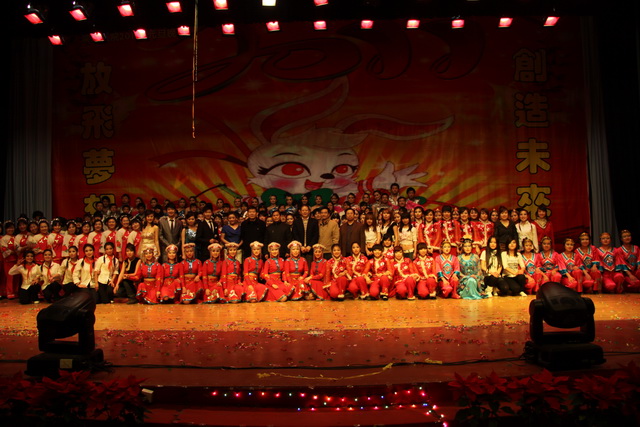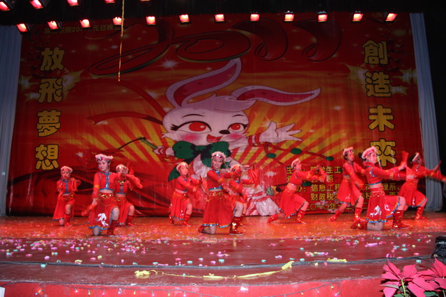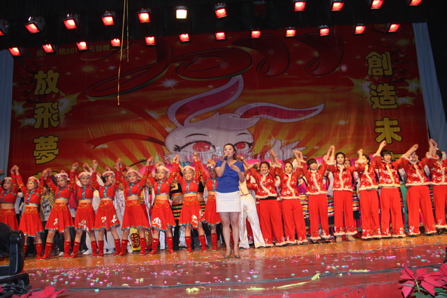 晚会在一段充满喜气,欢乐祥和的开场舞《春节序曲》中正式拉开帷幕,激情洋溢的现代舞《Losing you》、《旋转》、《不听话的玩具》给会场注入了青春与活力的气息,民族舞《七月的火把节》、《西域风情》等曼妙的舞姿把师生们带入了异域的风情之中,《排舞串烧》里那美妙的舞姿再现了老师们的年轻与活力,《论捧逗》的幽默诙谐引来师生们的阵阵掌声,话剧《用爱点亮他的心灵》触动人的心灵,由张欣瑞老师领唱的《相逢是首歌》把会场的气氛推向了高潮,那柔美的歌声和美好的祝福让众人叫好。晚会在《相逢是首歌》的柔和旋律下进入尾声,并在领导与演员们的合影留念下圆满落幕。