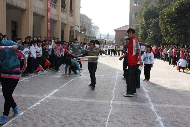 四点十分,开幕式正式开始,首先是张朴老师致开幕词,他希望我们能在健身中娱乐,增强同学们之间的团结协作,之后由程军峰老师详细地讲了此次游戏的规则,最后,宿管会主席王新同学发言,她表示了此次活动宿管会全体成员会兼着公平、公正、公开的原则,同时也会认真的为同学们服务的决心。接着游戏活动正式拉开了帷幕,同学们热情高涨,各参赛队员都积极的在赛道的起点处准备着。随着哨声的响起,两队的比赛正式拉开了帷幕,第一关是袋鼠运瓜,两队分别有5名同学,三名同学站在起点,两名同学站在终点,往返运球,进行迎面接力,第二关是踢毽子入桶,每名参赛者必须踢进两枚毽子,才可以进行到下一轮呼啦圈竞走比赛。第四关是穿珠引线,每位参赛者都要先转圈,然后再倒走穿珠,走到终点。最后,在终点处再进行每队两组的六人七足游戏。整个活动过程中,若有同学不小心摔倒,宿管会的成员就会立即上前扶起,其他同学则会为他们呐喊加油,随着一声声整齐洪亮的加油声,运动会进入了高潮。学生参赛队比赛结束后,是老师和学生合作的比赛,老师和学生分为两组,也分别进行了闯难关的比赛,每位老师脸上都洋溢着欢笑,此次活动在老师和同学们的欢笑中落幕。