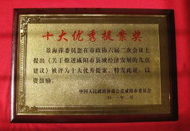 陕财职院教师、咸阳市政协委员景海萍,在政协咸阳市六届二次会议上提出《关于咸阳市县域经济发展的几点建议》,在政协咸阳市六届三次会议上被评为“十大优秀提案”;她本人还被评为2009至2010年度“优秀市政协委员”,并颁发了奖牌和奖杯。