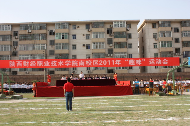 2011年4月27日上午,南校区第二届“趣味运动会”在我院南校区操场上隆重拉开了帷幕。参加本次运动会开幕式的院领导有:院党委书记文锋,院长阎平,副院长范忠,副院长刘建彪,院党委副书记刘文雅,以及院学工部、体育部、信息工程系、会计系、教育网管中心等系部领导。与会嘉宾有:铁干院党委书记梁永和,院长张友民,后勤中心经理陈发辉、康会荣。刘建彪副院长主持了本次开幕式。早上八点整,阎平院长宣布:陕西财经职业技术学院南校区第二届“趣味运动会”开幕式现在开始。迎着朝阳,在欢快的运动会进行曲中,南校区全体运动员、裁判员举行了隆重地入场式。