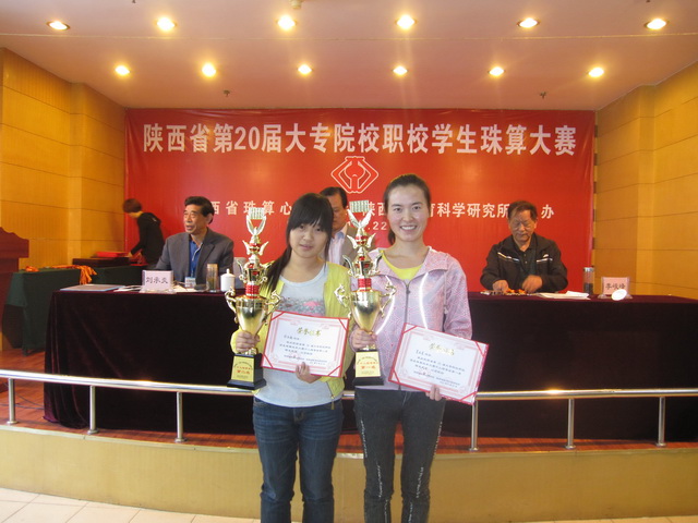 由陕西省珠算心算协会、陕西省教育科学研究所主办的陕西省第20届大专院校职校学生珠算大赛,2011年5月22日在西安军展大厦三楼会议室举行。本次参赛院校有西藏民族学院、西安科技大学、陕西财经职业技术学院、宝鸡职业技术学院、陕西能源职业技术学院、杨凌职业技术学院、陕西工业职业技术学院、西安职业技术学院、陕西省商贸学校、陕西省经贸学校、陕西省第二商贸学校、榆林财贸学校、西安雁塔区职中、西安实验职业中专等13所大专院校16支代表队48名选手。比赛分加减算、乘算、除算、账表算四个项目,每个项目比赛时间10分钟,限时不限量。