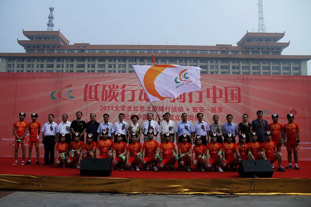 7月23日,由中国轻工业联合会、中国关心下一代工作委员会和中国自行车协会共同主办的“低碳行动骑行中国”2011大学生红色之旅骑行活动西安—延安段启动仪式在陕西省西安市新城广场隆重举行。陕西省人大常委会原副主任、陕西省关工委主任李天文,陕西省人民政府原副省长、陕西省老年体育协会主席潘连生,中国自行车协会理事长马中超,陕西省关心下一代工作委员会、陕西省精神文明办公室、陕西省教育厅、共青团陕西省委、陕西省妇联、西安市关工委、我院和省内部分高校领导及有关单位出席了西安-延安段的启动仪式。