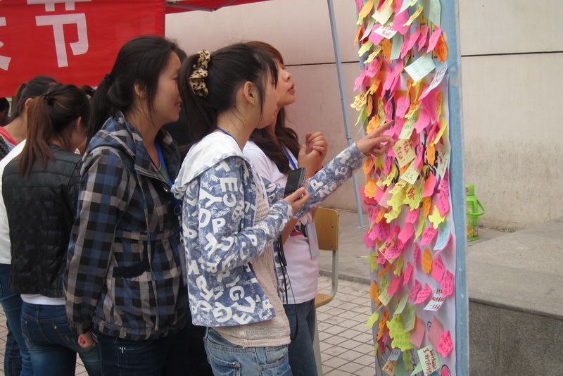 5月23日、24日,心理健康教育与咨询中心邀请咸阳高校六位心理老师分别在南校区和校本部做了现场心理咨询活动。活动主要由现场咨询、现场测评和心灵墙为主。参与现场咨询的同学们积极性非常高,咨询场外排起了长队,同学们都敞开心扉与老师交流,解决内心的困惑;参与心理健康测评的同学们更是热情饱满,都能通过测评对自己有一个深入的了解;心灵墙活动是最受欢迎、参与人数最多的一个活动,同学们拿起彩色的纸和彩色的笔将自己“彩色”的愿望书写下来贴于心灵墙上,最终编制成一幅美丽的大学“梦想”。