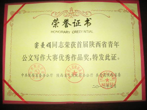 窦曼娟在陕西省首届青年公文写作大赛中荣获优秀作品奖