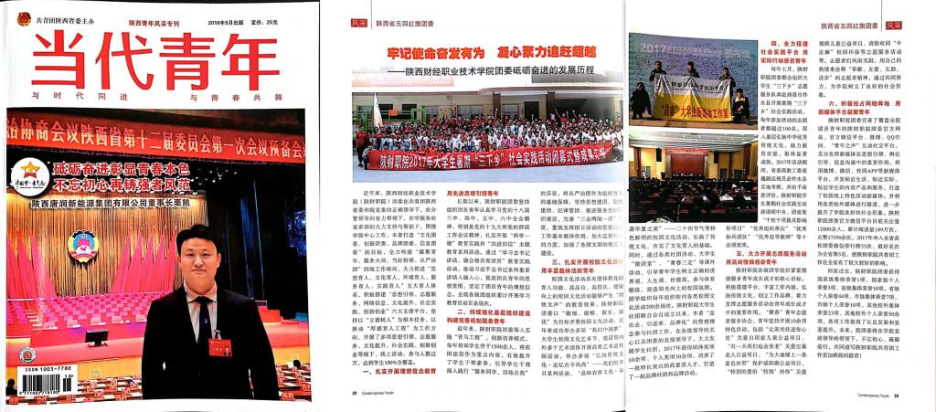 近期,共青团陕西省委主办的《当代青年》2018年9月版专版中刊发了题为《牢记使命奋发有为凝心聚力追赶超越——陕西财经职业技术学院团委砥砺奋进的发展历程》的报道。本次风采展示共刊发四所院校的共青团工作。