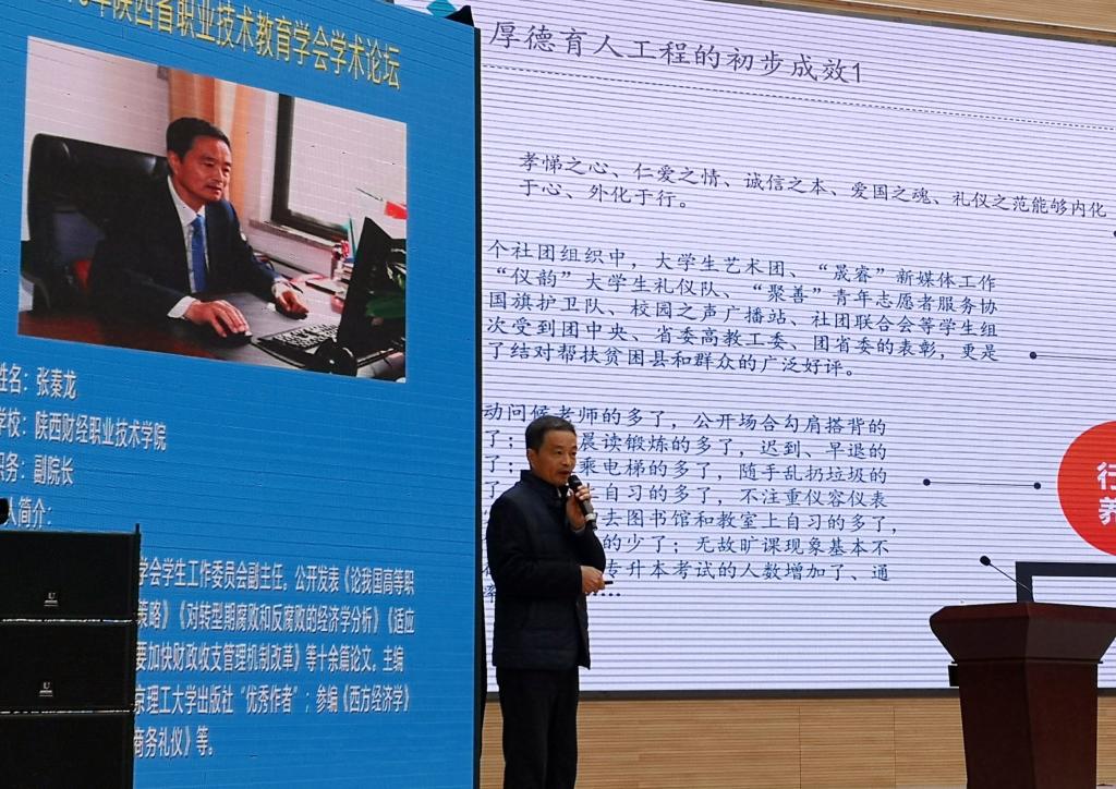 最后,会议组织召开了“创新·融合·质量·一流”学术论坛,17所高职院校的22位代表分别围绕论坛主旨作了典型经验交流发言。我院副院长张秦龙代表学院在会上作了题为 “全面推行‘五位一体’厚德育人工程,着力提升人才培养质量”的交流发言,分别从厚德育人工程推行的背景、实践和探索、全面推行、效果展示等四个方面向来自全省高职院校的四百多名教师做了分享,精彩的主题发言得到了兄弟院校同仁的阵阵掌声和认同。