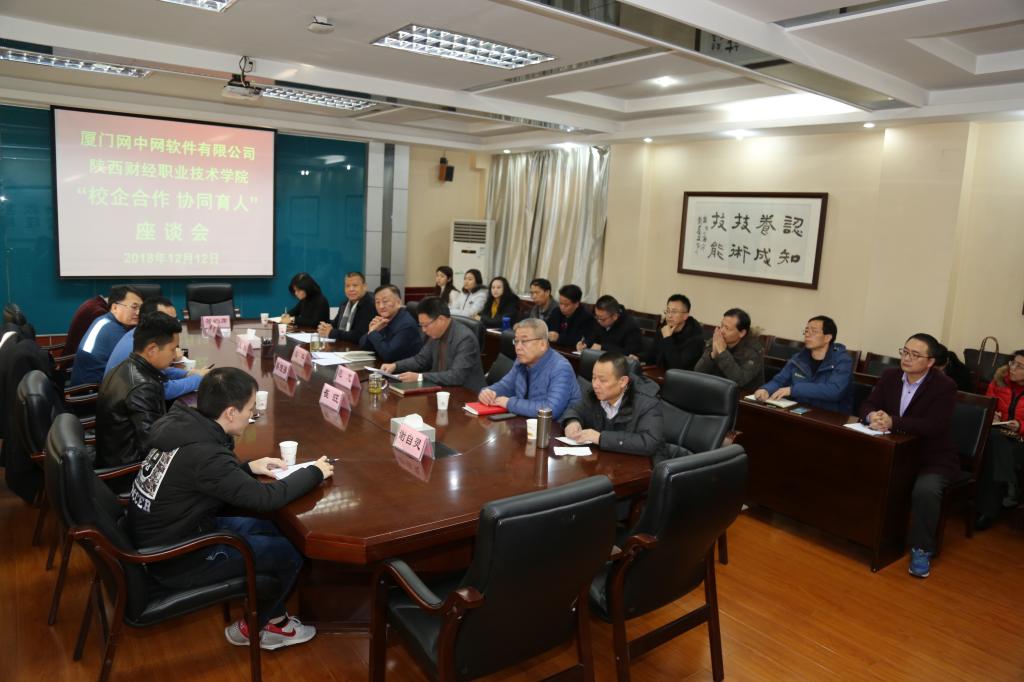 2018年12月12日上午,我院同厦门网中网软件有限公司在办公楼四楼会议室召开“校企合作协同育人”座谈会。会上,双方签订战略合作协议。学院院长阎平、副院长范忠,厦门网中网软件有限公司总裁、正保远程教育高级副总裁蔡理强,中教畅享(北京)科技有限公司总经理王鹏出席会议,厦门网中网软件有限公司西北大区销售总监、研发部项目经理与我院教务处、科研处、各二级学院、思政部、基础部等相关部门负责人参加会议。
