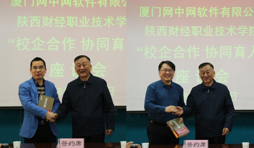 随后,阎平为与会嘉宾赠书。范忠代表学院与厦门网中网软件有限公司签订战略合作协议。蔡理强代表厦门网中网软件有限公司向学院赠阅专业书籍1000册。