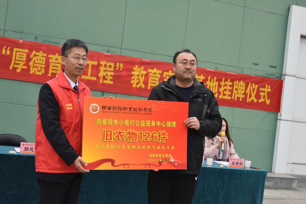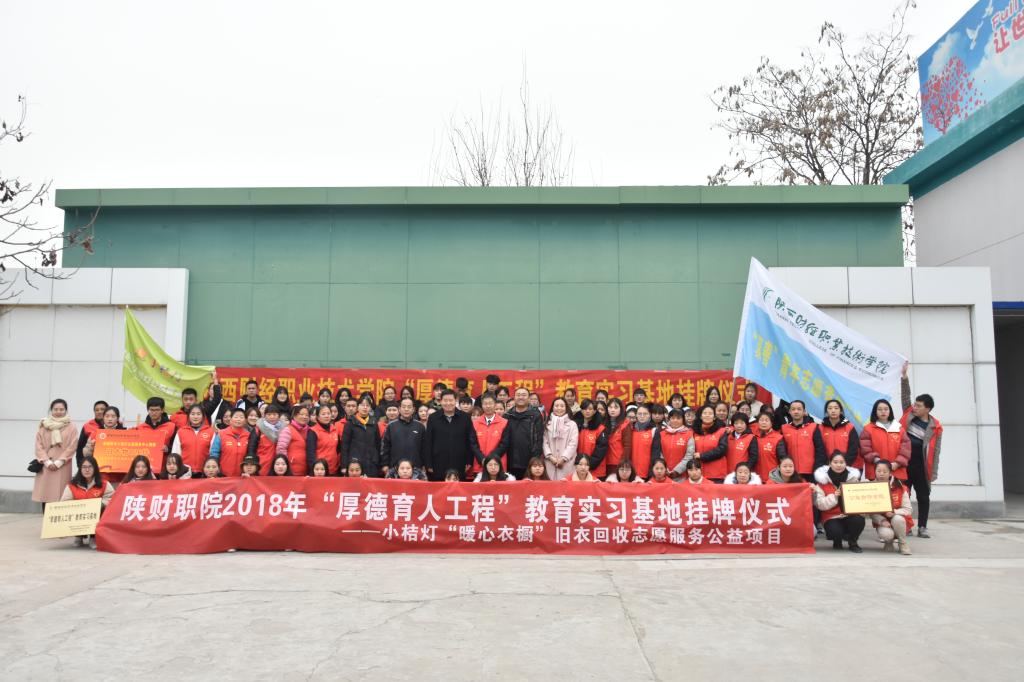 2018年12月21日下午15:00,我院团委在咸阳市小桔灯公益服务中心举办了“厚德育人工程”教育实习基地揭牌仪式暨2019年“‘衣’路有你·一路温暖”志愿服务公益项目启动仪式。出席此次活动的有我院党委副书记兼纪委书记刘文雅,党委宣传部部长兼文明办主任严丽丽,工会主席王爱军;咸阳市小桔灯公益服务中心名誉监事长、国网咸阳供电公司党委副书记兼纪委书记陈杰,咸阳市小桔灯公益服务中心主任郭恩伟,以及我院100余名志愿者代表。