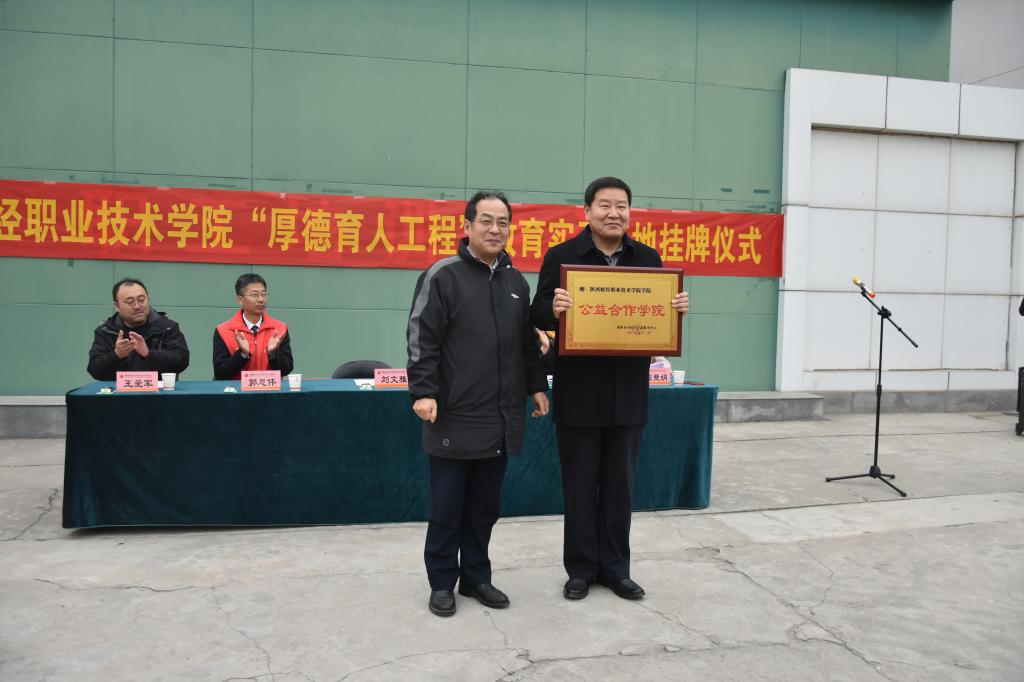 | 咸阳市小桔灯公益服务中心名誉监事长、国网咸阳供电公司党委副书记兼纪委书记陈杰向我院赠予“公益合作学院”牌匾 |