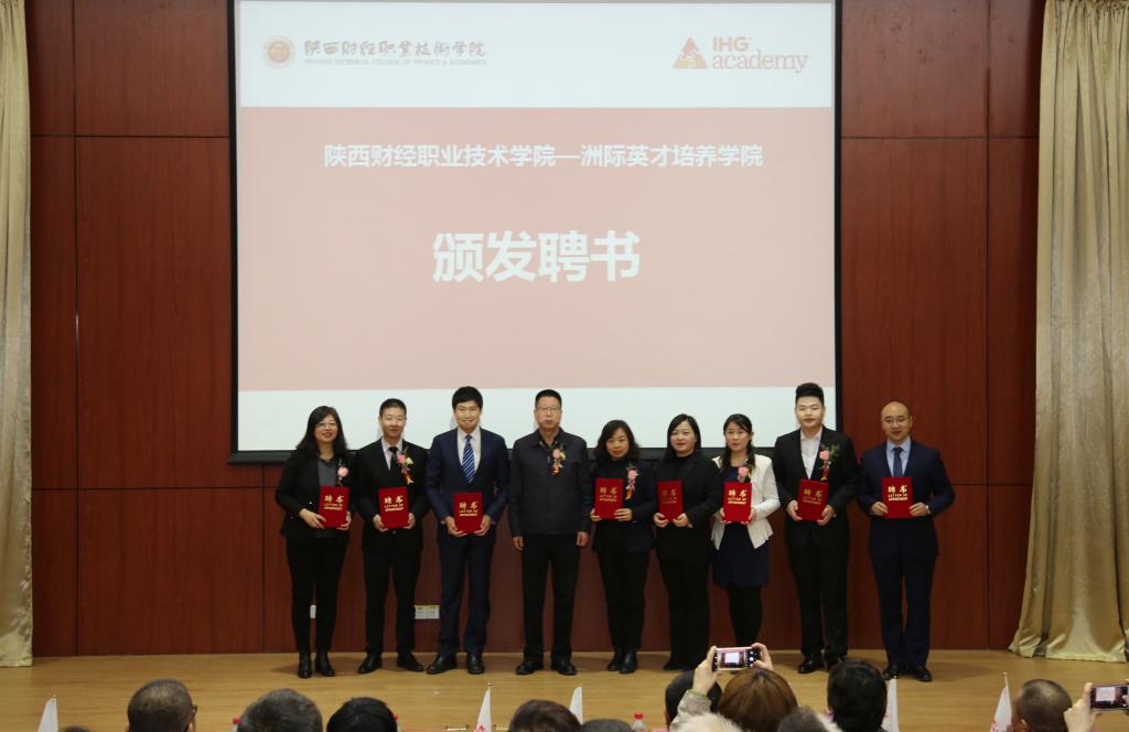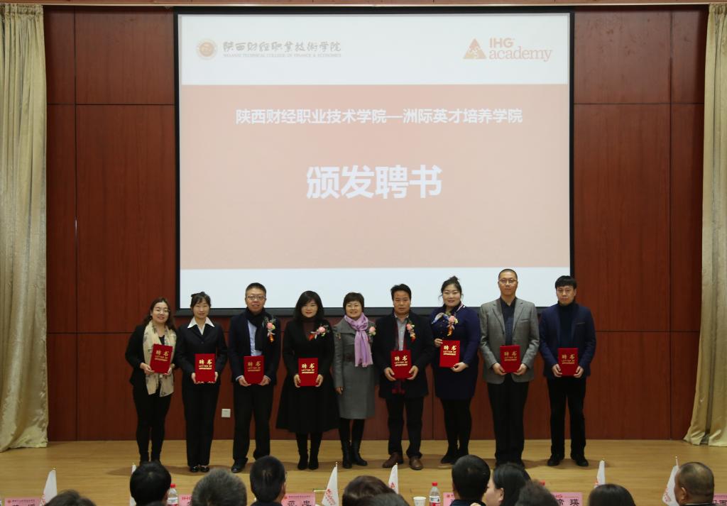 | 范忠为洲际酒店方人员颁发陕西财经职业技术学院洲际英才培养学院分院长、副院长、秘书、岗位师傅及客座教授的聘书 |