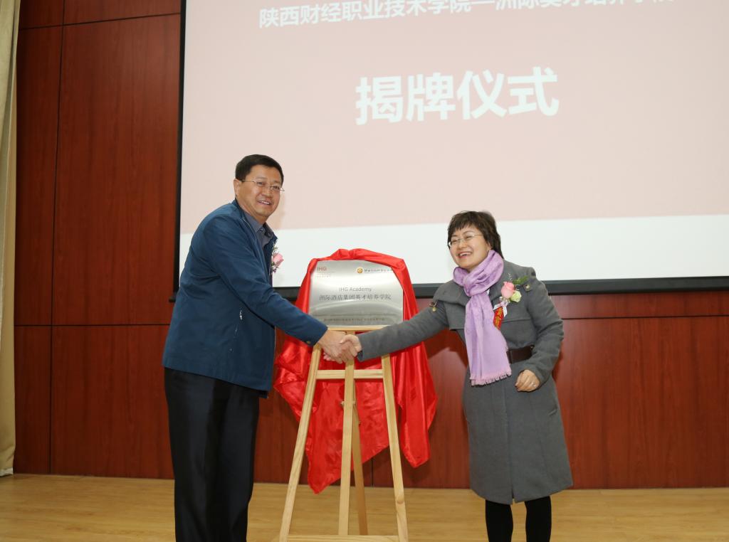 | 张志华和席瑛共同为“陕西财经职业技术学院洲际酒店集团英才培养学院”揭牌 |