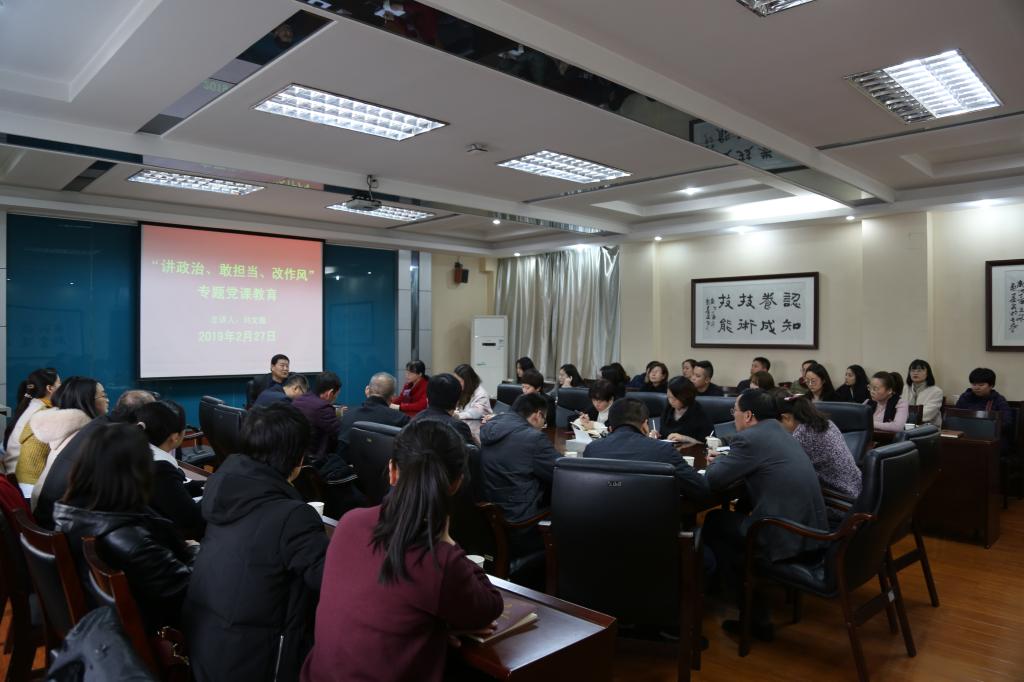 2019年2月27日下午4点,学院党委副书记兼纪委书记刘文雅在办公楼四楼会议室讲授“讲政治、敢担当、改作风”专题教育党课,其分管部门和所联系指导的基础部党支部党员共40余人参加党课学习。