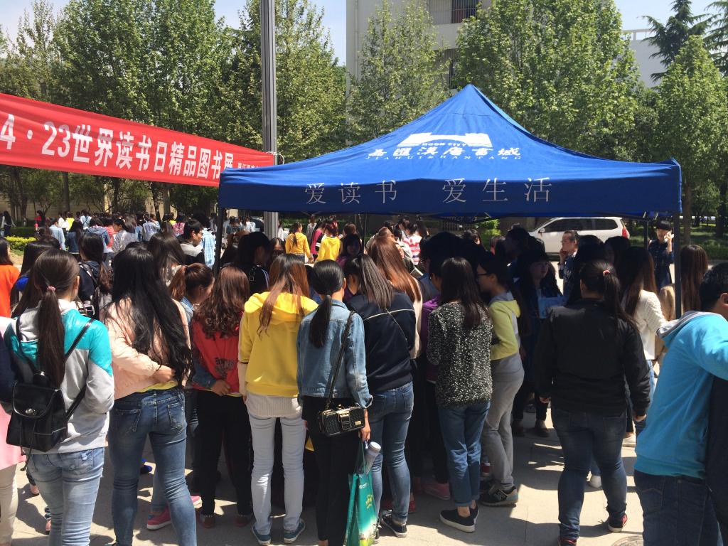 根据师生反应,为了满足更多同学的选书热情,4.24日图书馆又和嘉惠汉唐书城咸阳市分公司联合举办了第二场活动,为了使活动更加贴近学生,这次把选书活动直接放在了综合教学楼前。11点45分下课后,尽管是周末,许多同学归心似箭;尽管艳阳高照,气温很高,但是大家看到新书展台后,同学们的情绪又一次高涨了,小小的新书展台被学生围的水泄不通,头一天没有选到心仪书籍的再一次寻觅起来;头一天选到的书被其他同学捷足先登的,希冀这次能满载而归;没带图书证的,在大太阳底下排着队打电话让舍友回宿舍取了再送到现场;头一天不知道有这样一个活动的同学今日早早赶到现场;原打算回家的同学甚至放弃了回家而准备选几本书美美地看上两天……活动一直持续到中午快2点钟,火热的天气和同学们的选书的热情一样高涨。