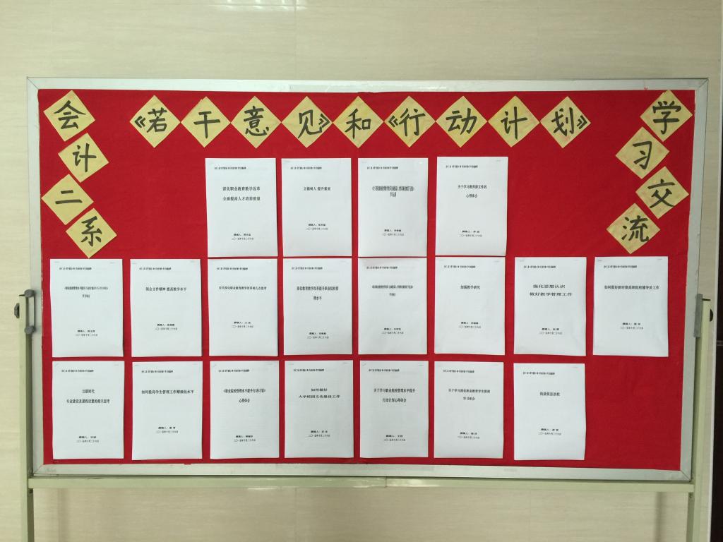 根据学院办公会议纪要精神,会计二系主任李启明先后在系党总支学习会及教学例会上要求全体党员及教工在认真深入学习《教育部关于深化职业教育教学改革全面提高人才培养质量的若干意见》和《职业院校管理水平提升行动计划(2015-2018年)》两个文件后,提交心得体会并制作学习交流展板。