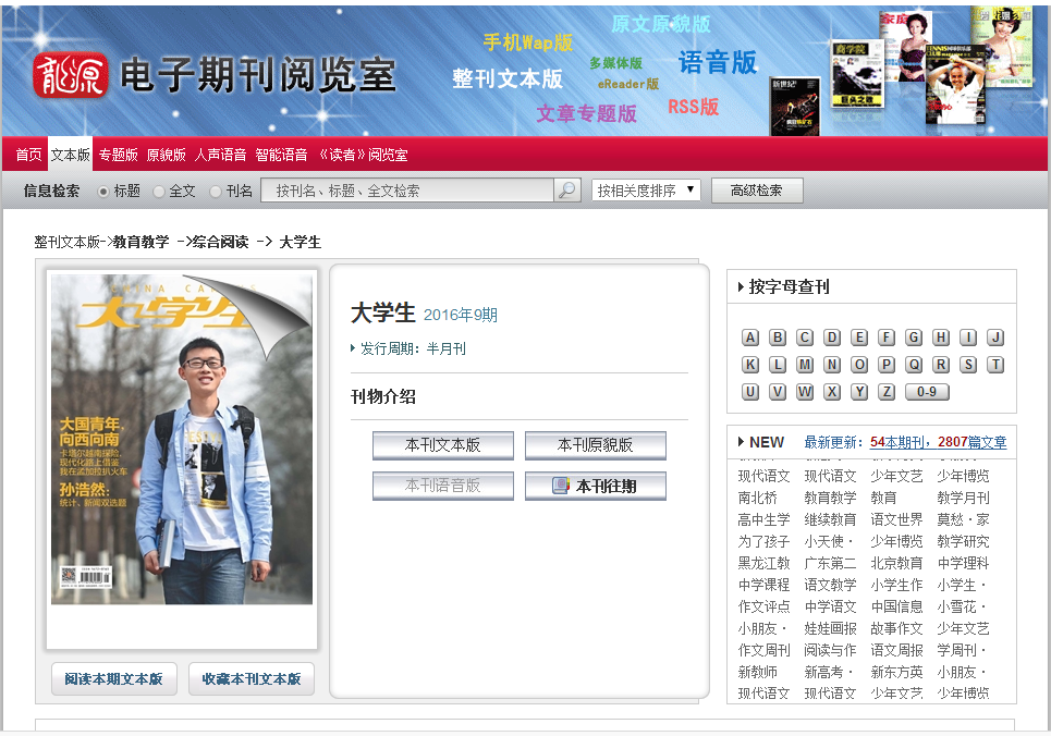 龙源期刊最大的特色就是多版立体阅读,分别是:整刊版,提供刊物的目录和全文,以及往期检索,读者可以更直接的选择自己喜爱的期刊阅读。专题版, 完全突破每本杂志的局限,按照不同的类别划分不同的专题,使读者聚焦自己感兴趣的话题。 原文原貌版, 原汁原味,再现纸板期刊原貌,无需下载安装浏览器,电子版翻阅更便捷。 语音版,打破期刊文字的束缚,让我们的期刊“动”起来,男声女声两个版本的语音阅读,变读刊为“听刊”。