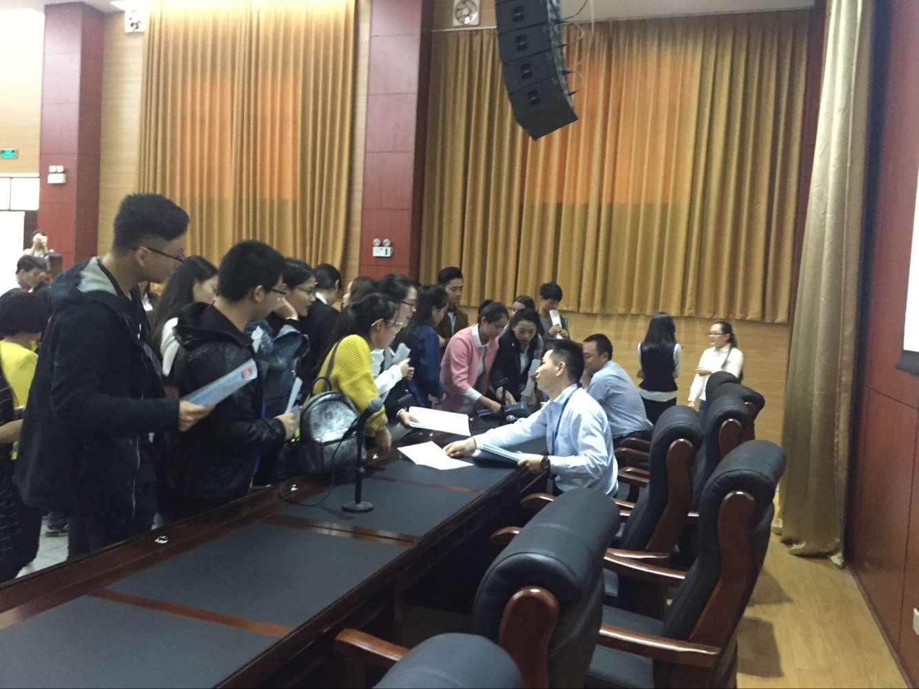 宣讲结束后,工作人员收取了简历并给20分钟提问时间,学生提出了很多好建议。诸如:“公司信用卡业务有哪些渠道?现在录用,能否立即签定劳动合同?男女生在公司待遇是否一视同仁?公司能否给每一名新进员工一个公平的晋升平台?”李经理和其他两位工作人员都一一作答,热情而耐心的讲解博得了现场学生掌声不断。
