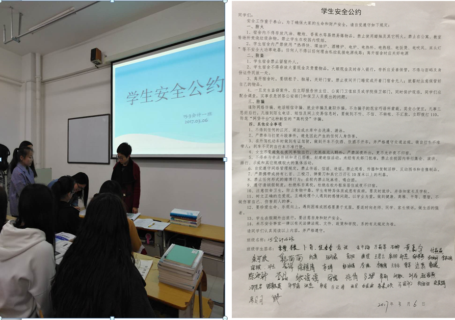 晚自习时,各辅导员、班主任进教室召开主题班会,组织同学们学习了《学生安全公约》,对《公约》中提出的防火、防盗、防骗及其他安全事项,尤其是防范“网贷平台”这种新型的“高利贷”诈骗进行了说明讲解。《公约》号召广大学生校园安全无小事,方方面面要注意。同时为了树立同学们的契约精神,牢固安全意识,组织学生签订了《学生安全公约》,并张贴在教室前面,随时给大家起到警醒作用。