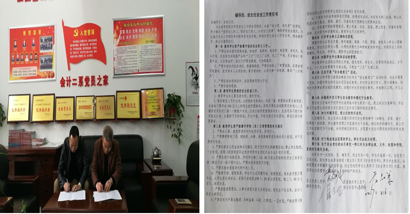 为全面贯彻落实学院关于“党政同责、一岗双责、失职追责”的安全工作要求,本着“谁主管,谁负责”的原则,努力做到“看好自己的门、管好自己的人、理好自己的事”,确保学院的安全稳定工作。2017年3月6日下午5时,会计二系主任李启明、专职副书记乔晶策与全体辅导员、班主任签订了《辅导员、班主任安全工作责任书》。要求辅导员、班主任教育学生要严格遵守公寓管理规定,树立正确的恋爱观,认真召开“安全教育主题班会”,加强校内外实习、实训学生安全和遵纪守法教育。明确目标责任,做好安全工作。
