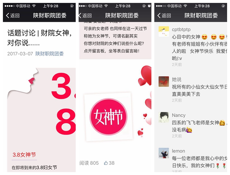 同时,在线上发起了“财院女神,我想对你说”的话题讨论,共有近千人参与到了讨论中,同学们纷纷在平台留言,表达了对自己的妈妈、老师等女同胞的感激与爱戴之情。