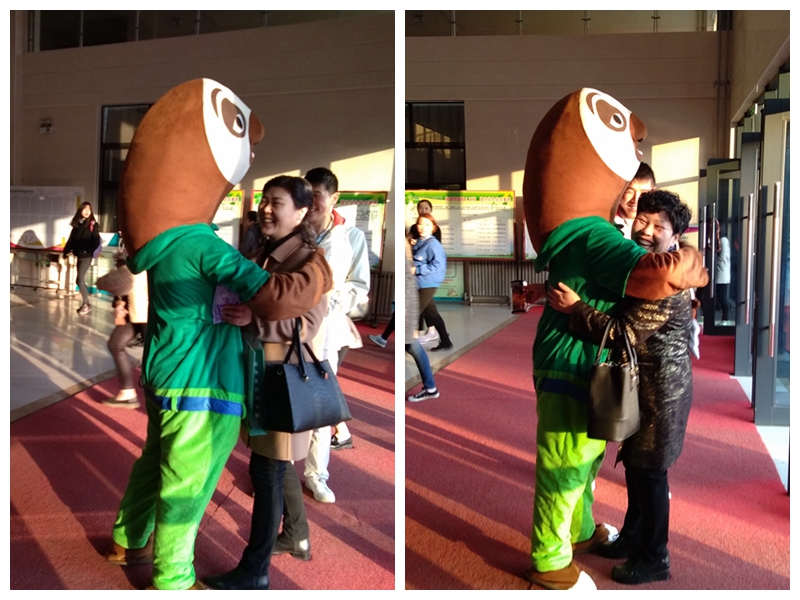 志愿者们穿上玩偶服,为每一位过往的女教师送上温暖的祝福,并与来往教师、同学进行互动,有即兴表演、送祝福、抽奖、扔沙包得礼物等活动环节。憨态可掬的玩偶使得现场气氛异常热烈,大家纷纷拿出手机合影留念,老师们的脸上都洋溢着幸福快乐的笑容。