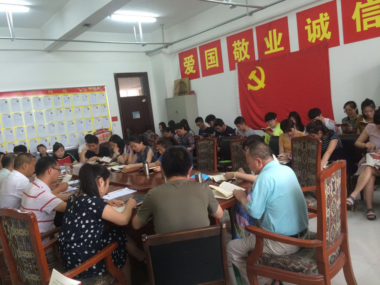根据安排,在会计一系党总支书记马西牛的领诵下,全体党员集体朗诵党章(第一章第3条、第9条和第七章第37条、第38条),在琅琅的诵读声中,全体党员对党的性质、宗旨、指导思想、奋斗目标以及党员的权利和义务,有了更深刻的理解,同时对于如何做一名合格党员有了更加清醒的认识,进一步增强了党员们的底气、正气和锐气。大家心潮澎湃,不约而同地向会议室的党旗行注目礼。
