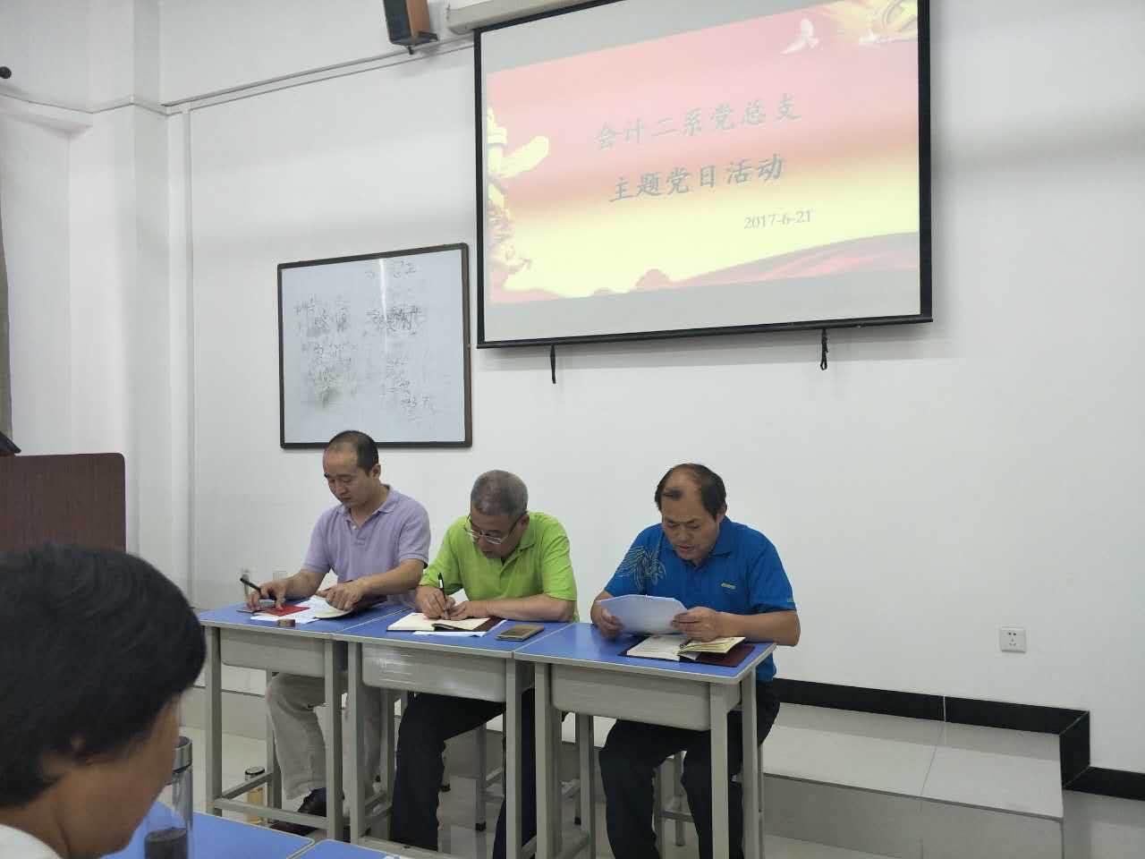 根据学院“两学一做”学习教育常态化制度化的工作部署,会计二系党总支6月21日下午4点半在综合楼415教室组织召开“主题党日活动”。会计二系全体教工党员及学生预备党员36人参会,会议由会计二系专职副书记乔晶策主持。