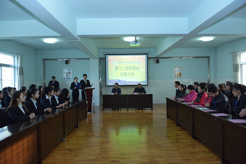 11月6日下午4点,在AB楼学生公寓二楼大厅,召开了第十二届宿管会学生干部任职大会,参与本次大会的人员有保卫处副处长兼学生处负责人郭宝东、学生公寓管理科负责人王勇、各公寓管理老师、第十一届宿管会部分学生干部及第十二届宿管会全体学生干部。