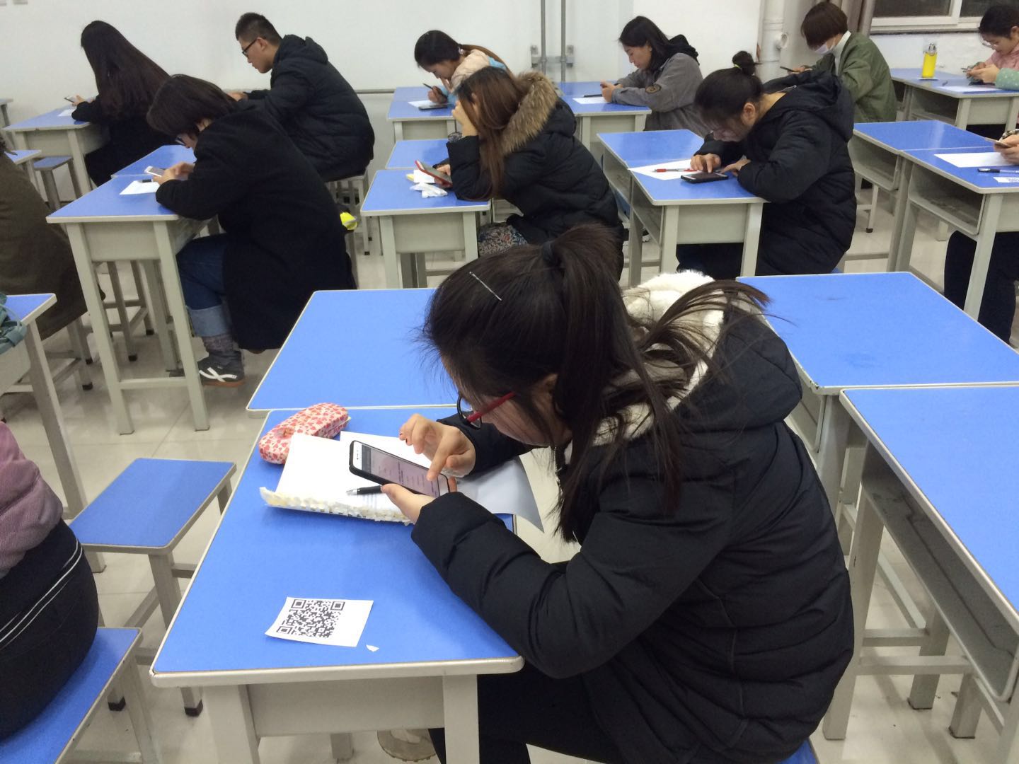借用巧用“二维码”,开创党课考试新形式,12月7日晚自习,在党课考试中,每位应试者手持一部手机,通过扫二维码,进入答题系统,在规定的时间内答完系统中的试题,中间不能退出,否则不能重新登录,成绩视为0分,考生答完试卷后,在系统在中填写姓名、班级、电话号码,点击“提交”,立马弹出一个对话框,上面显示着答对多少题,得分是多少。这种新型的考试方式最大限度地杜绝了作弊,“公开、透明、公正”,有助于党支部真正选拔出优秀人才。
