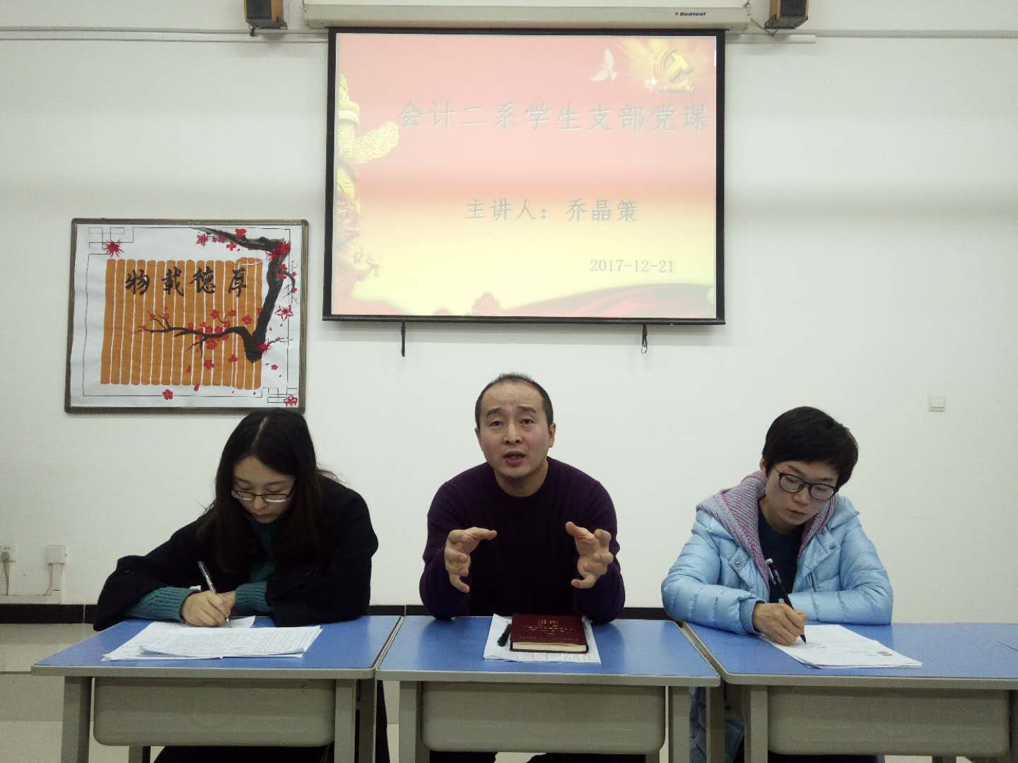 2017年12月20日晚7时,会计二系学生党支部在综合楼415教室召开了2017年下半年学生党员发展暨转正大会。参加本次会议的有会计二系党总支书记李启明、教工支部书记曹耀辉、专职副书记乔晶策以及所有入党介绍人老师。会议由学生支部宣传委员师丽珍主持。