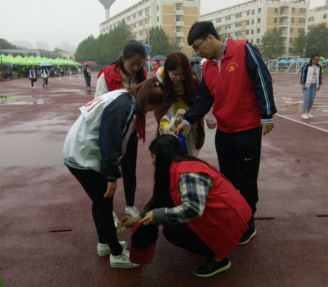 比赛过程中,到处可见会计三系的党员先锋志愿者的身影,他们默默的为运动会工作付出。雨越下越大,运动会如火如荼的进行着,瓢泼的大雨没有击退同学们比赛的勇气,也没有浇灭会计三系学生党员先锋志愿者的热情,他们在环境恶劣的情况下,即使大雨淋湿了衣服和头发,冷的涩涩发抖,也要坚守在赛道旁,维持秩序为运动健儿努力营造良好的运动环境。