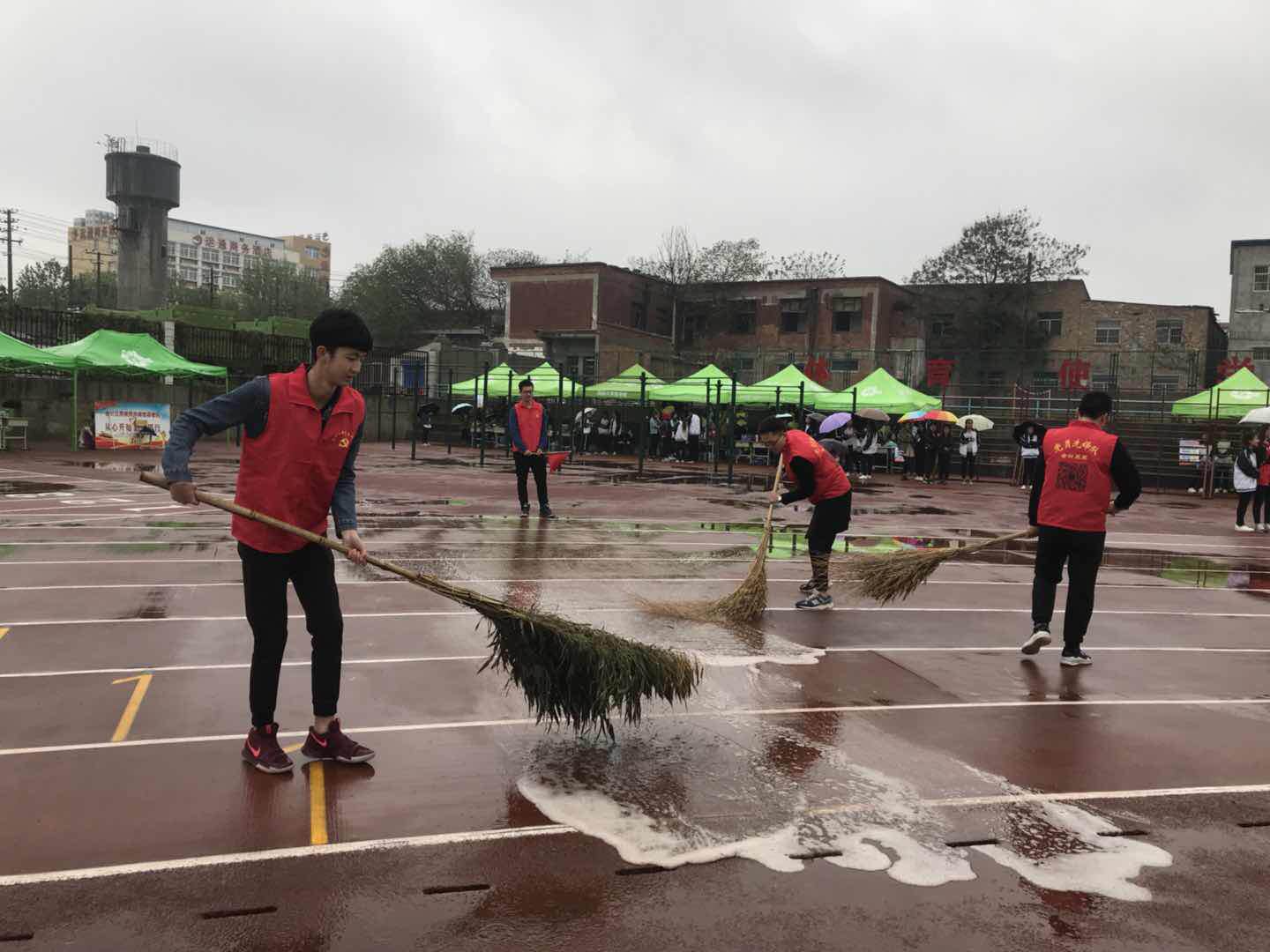 4月12日早上7点,会计三系学生党员先锋志愿者队一早在学院操场集合,开始工作。由于昨晚一夜风雨,导致操场上雨水堆积,会计三系的志愿者先锋队考虑到了运动员的安全问题,为了给运动员们创造良好的比赛场地,他们一遍又一遍的扫积水一遍又一遍的拖干积水,充分展现了三系全体学生党员关心同学和乐于奉献的精神。