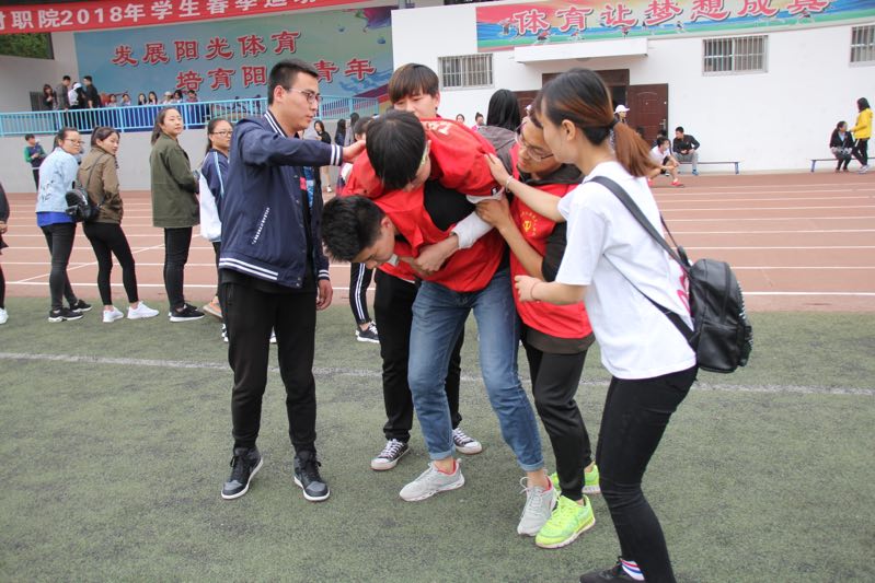 在男子100米比赛中,一位运动员不慎摔倒,导致腿部及腰部受伤,王江晗、张珂、别鹏飞三名志愿者上前将这位受伤的同学背至宿舍,为他清理伤口并进行了简单包扎。通过这一件小事体现了会计三系同学互帮互助、富有爱心的品质。