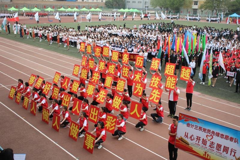 开幕式上,三系的老师与同学精神抖擞、斗志昂扬。教师们统一着装,手拿国旗,迈着坚定的步伐,向所有人展示了三系“人文厚德,团结和谐,开放包容,创新进取”的系部文化;彩旗方阵的同学们,昂首挺胸,整齐划一,五颜六色的彩旗迎风飘扬;紧接着是“四十八字标语”的学生党员先锋志愿者队方阵,让我院的育人理念和核心价值观时刻牢记每个人的心中;最引人注目的是三系的扇子和舞旗方阵,他们姿态优美,气势恢宏,凤凰腾飞,震撼人心,预示着运动会的顺利召开以及会计三系广大莘莘学子对陕财职院日益辉煌的美好祝愿。“台上一分钟,台下十年功”,同学们牺牲自己课余时间,加紧训练,无怨无悔,只为将精彩的瞬间完美展示给各位观众,这种精神让人感动,这份执着让三系的全体师生倍受鼓舞。