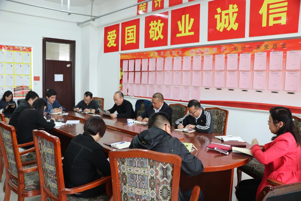 4月25日下午党会期间,会计一系全体教职工集体学习了《“不忘初心,牢记使命”探寻习近平总书记在梁家河的青春足印》,副书记姚七栋同志主持学习活动。