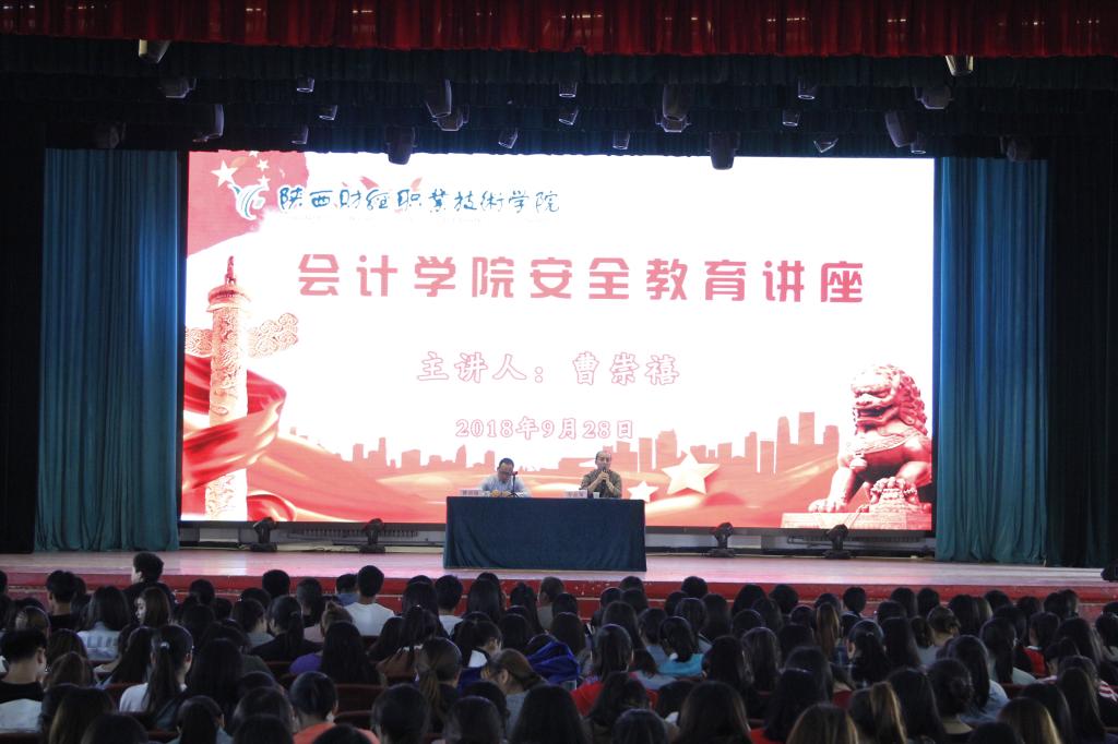 2018年9月29日下午,会计学院在学院大礼堂举办了安全教育讲座,由会计学院有着24年学管经验的辅导员曹崇禧主讲,会计学院2017级全体学生、2018级五年制新生及全体辅导员近1800人聆听了此次讲座,会计学院党总支书记乔晶策主持。