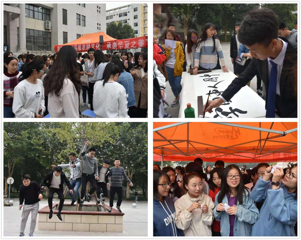 活动共包含四个项目:第一个是“寒露知识竞答”,四人一组,抢答成功的同学进入到第二环节 “拍照我最行”,一组同学同时跳跃,在照片中跳离地面最高的同学优先进入下一游戏环节,同学们奋力挑战、表情丰富的样子引得围观同学捧腹大笑。“指压板抢板凳”等小游戏让更多的同学加入进来,大家热情高涨,现场气氛热闹非凡。另一边,翰墨轩书画社的同学带来了精彩的现场书法表演,书法作品作为奖品赠与在活动中获奖的选手。