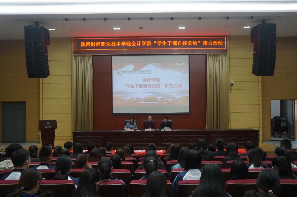 2018年10月11日下午2点,会计学院在学术报告厅举办了《学生干部自律公约》接力活动。会计学院党总支书记乔晶策、会计学院团总支书记乔乐、辅导员孟琰峰、团总支、学生会全体成员及全院79个班的班团干部近400人参与了此次活动。活动由辅导员孟琰峰主持。