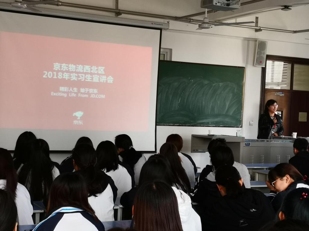 2018年10月11日下午4时,商学院2016级京东跟岗实习校园宣讲会在综合楼614合班教室举行。京东西北区人力资源部经理林琳、防损部组长柯雪丽,我院商学院院长董媛、商学院党总支书记张晓战,物流电商教研室全体教师和2016级物流管理、电子商务班学生共计125人参加了此次校园入职培训会。培训会由张馨予主持。