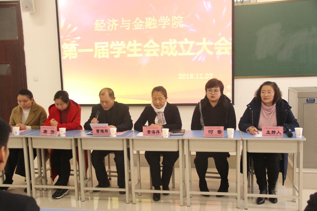 寄予着师生的殷切希望,承载着“博学慎思诚朴笃行”的财院精神,陕西财经职业技术学院经济与金融学院第一届学生会成立大会于2018年11月7日在综合楼714教室隆重召开。参加会议的有经济与金融学院院长景海萍、经济与金融学院党总支书记兼副院长曹耀辉、学生工作科何蕾、辅导员刘丹、席芳及全体学生会干部110余人。会议由经金学院团总支书记张欣瑞主持。